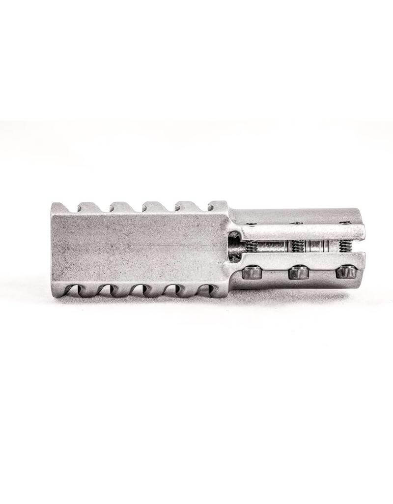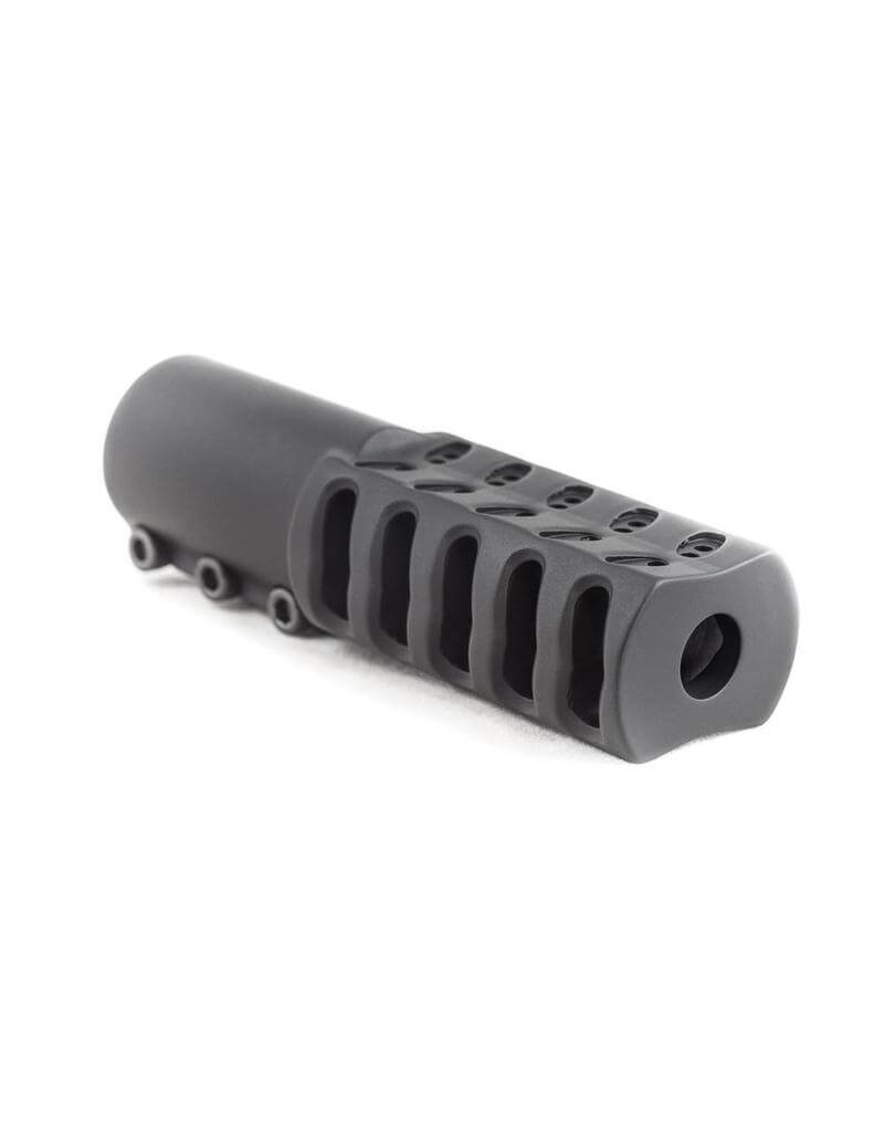 During testing we found that the 5 port design makes the most efficient use of the available gasses exiting the barrel to substantially reduce recoil. There are 20 .078″ holes drilled into the top of the brake that vent gas in order to stop muzzle rise. The bottom of the brakes have no holes or ports to kick up dirt all over the shooter. Having the bottom of the brake angled outward also helps to reduce muzzle rise. After months of testing and development the design of these brakes make them the most efficient clamp on muzzle brakes available today.